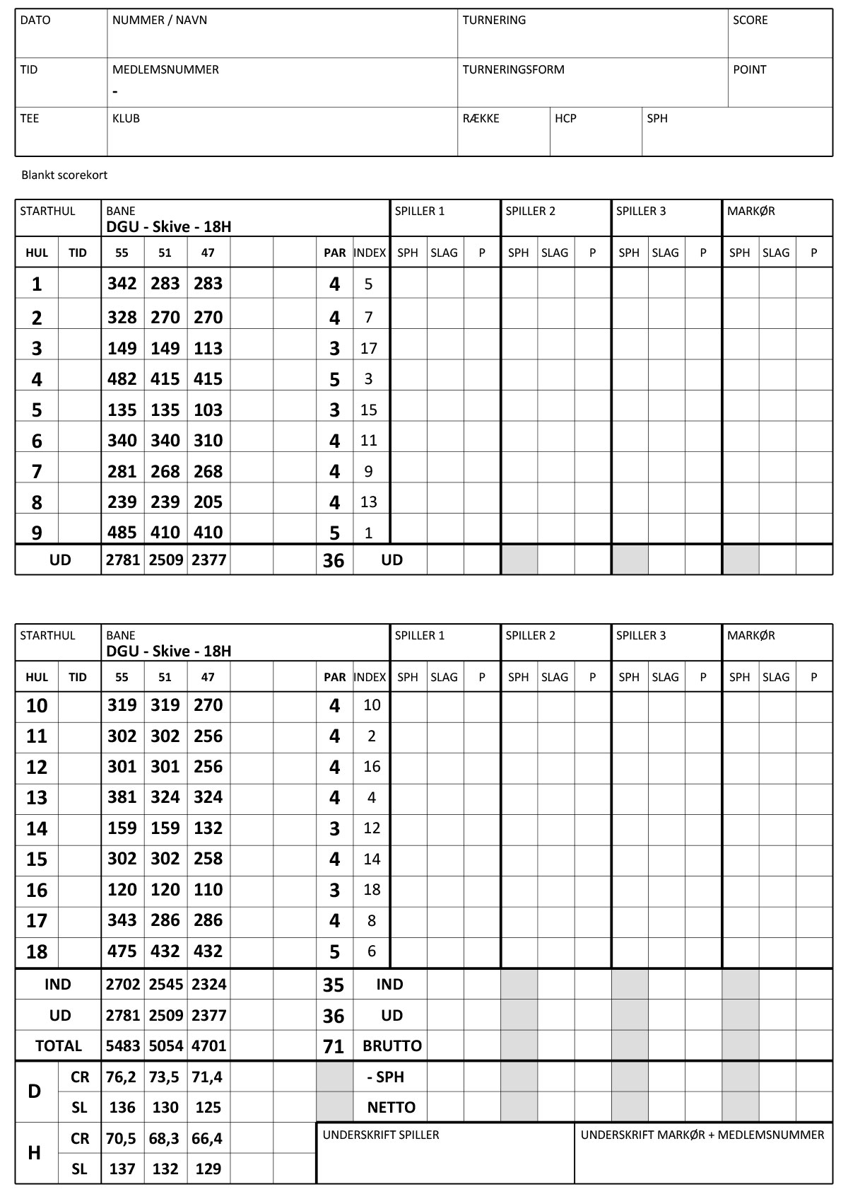 - 18 huller med standardscorekort – Scorekort 18 huller